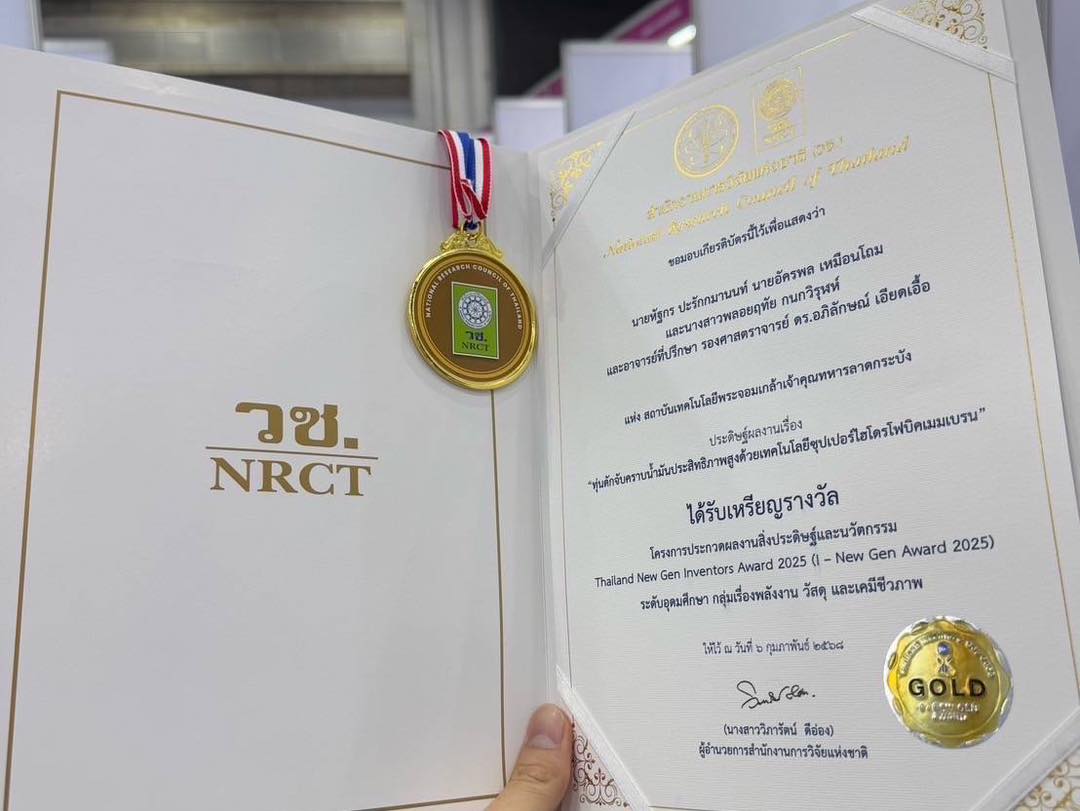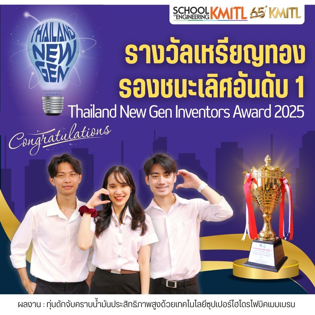 The Faculty of Engineering, KMITL, proudly congratulates students from the Financial Engineering Program (FE) and the Department of Nanoscience and Nanotechnology for their outstanding achievement at the Thailand New Gen Inventors Award 2025 (I-New Gen Award 2025), organized by the National Research Council of Thailand (NRCT) under the Ministry of Higher Education, Science, Research and Innovation (MHESI).