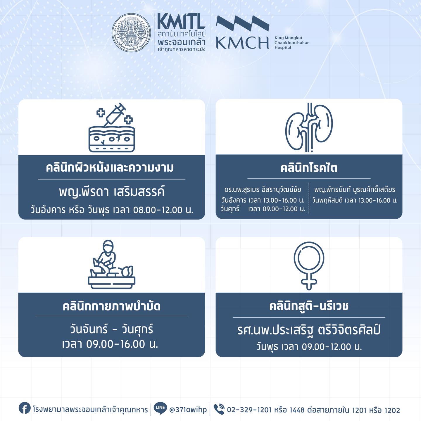 Located on the ground floor of the King Mongkut Chaokhunthahan Hospital (KMCH)   specializes in women’s health, including gynecological examinations, treatment of irregular menstruation or abnormal menstrual pain, and counseling on sexual and reproductive health.
